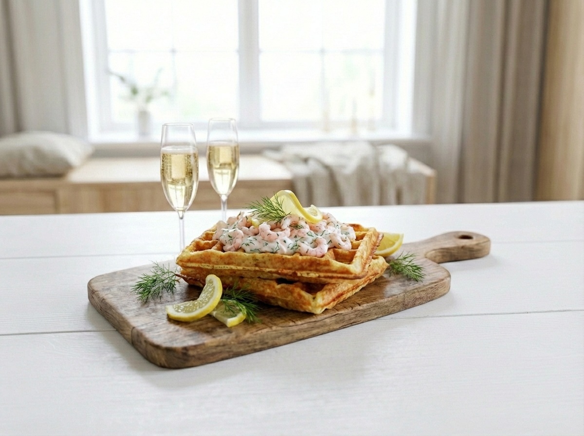 Suolaiset vohvelit katkaraputäytteellä sopivat brunssille, juhliin tai kevyeksi ateriaksi.